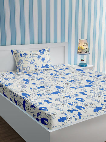 URBAN DREAM KIDS ABSTRACT DOODLE PRINT WHITE AND BLUE BEDSHEET SET